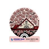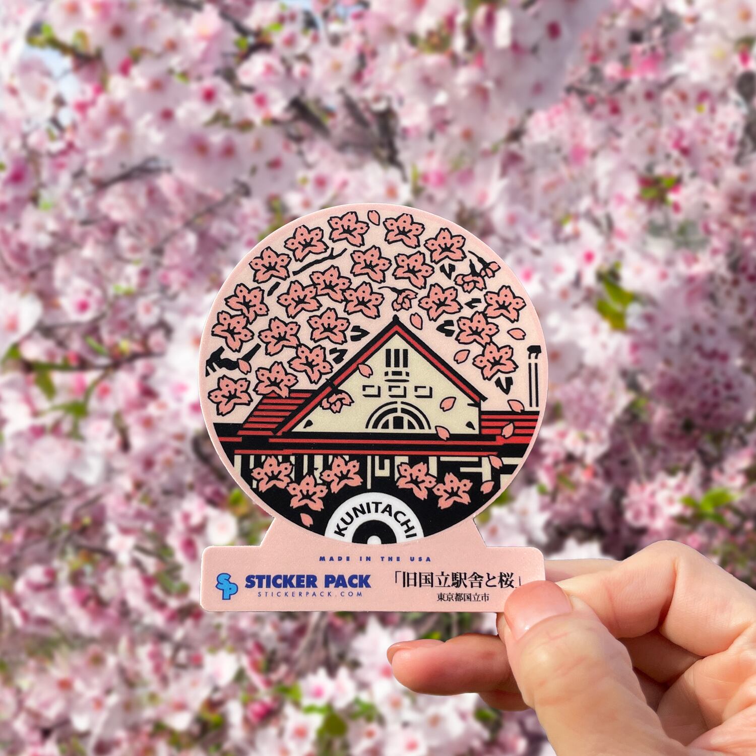 国立市の象徴になっている三角屋根の駅舎と桜をデザインしたステッカー